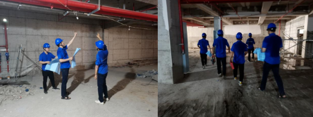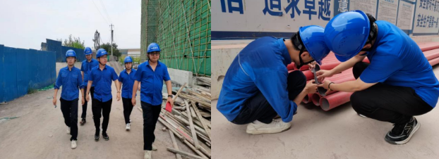 (左圖為每天早晨工地例行檢查 右圖為現(xiàn)場(chǎng)檢查消防管道壁)