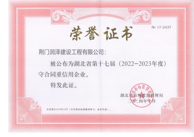 憑著“誠信為本、質量為根”的堅守,潤澤公司連續(xù)兩年獲評荊門市和湖北?。?022-2023年度)“守合同重信用企業(yè)”,市場競爭力和品牌影響力持續(xù)攀升。