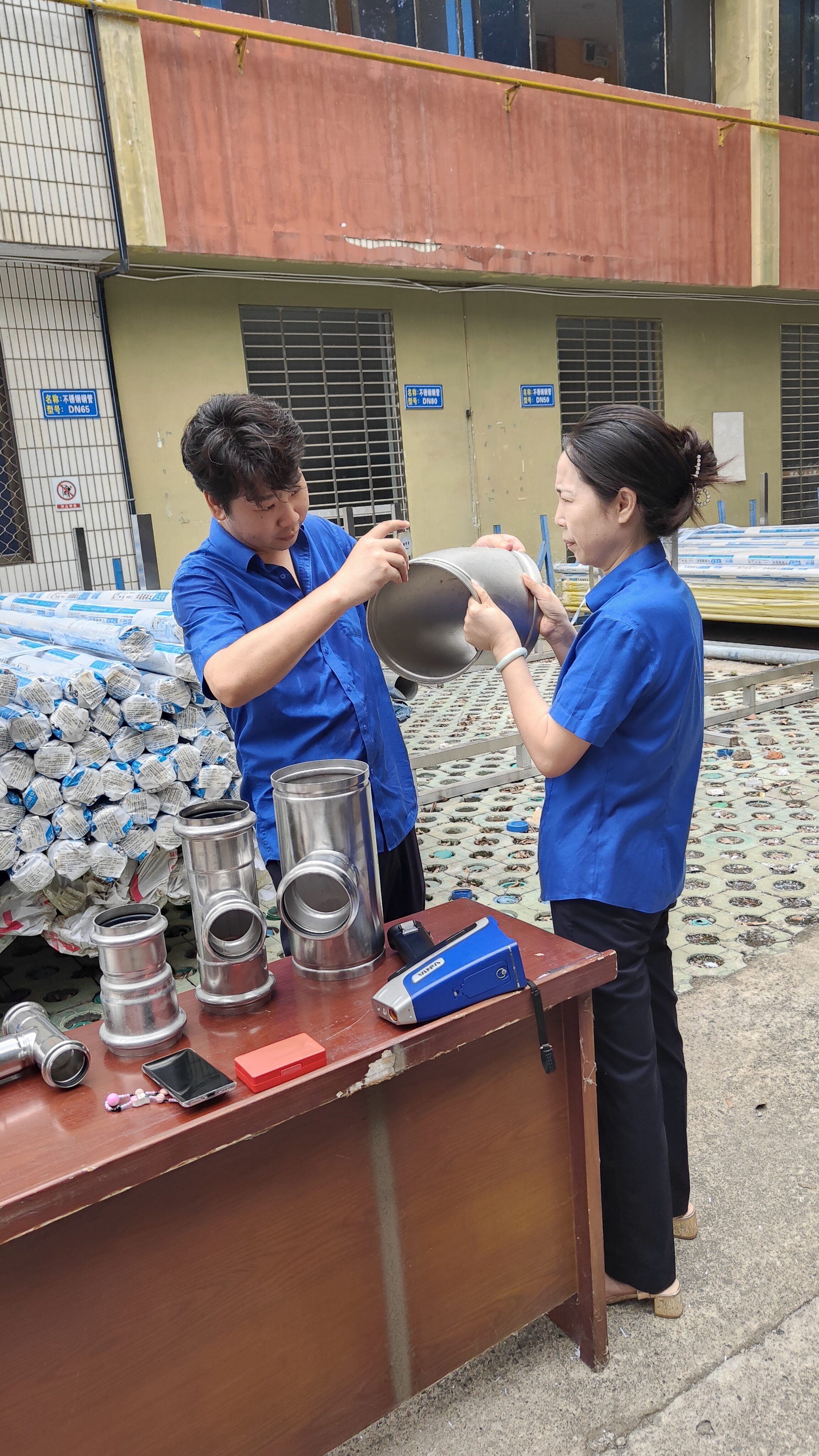 在實(shí)操比武環(huán)節(jié),參賽人員按流程對各類型號管件進(jìn)行鑒別與檢驗(yàn):運(yùn)用手持光譜儀檢測不銹鋼材質(zhì)成分,確認(rèn)是否符合不銹鋼304標(biāo)準(zhǔn);使用測厚儀測量管件壁厚,嚴(yán)格把控尺寸偏差;用卷尺測量長度,核對與標(biāo)準(zhǔn)值的誤差。整個比武過程規(guī)范有序,參賽人員嚴(yán)謹(jǐn)操作,展現(xiàn)了扎實(shí)的驗(yàn)質(zhì)功底。