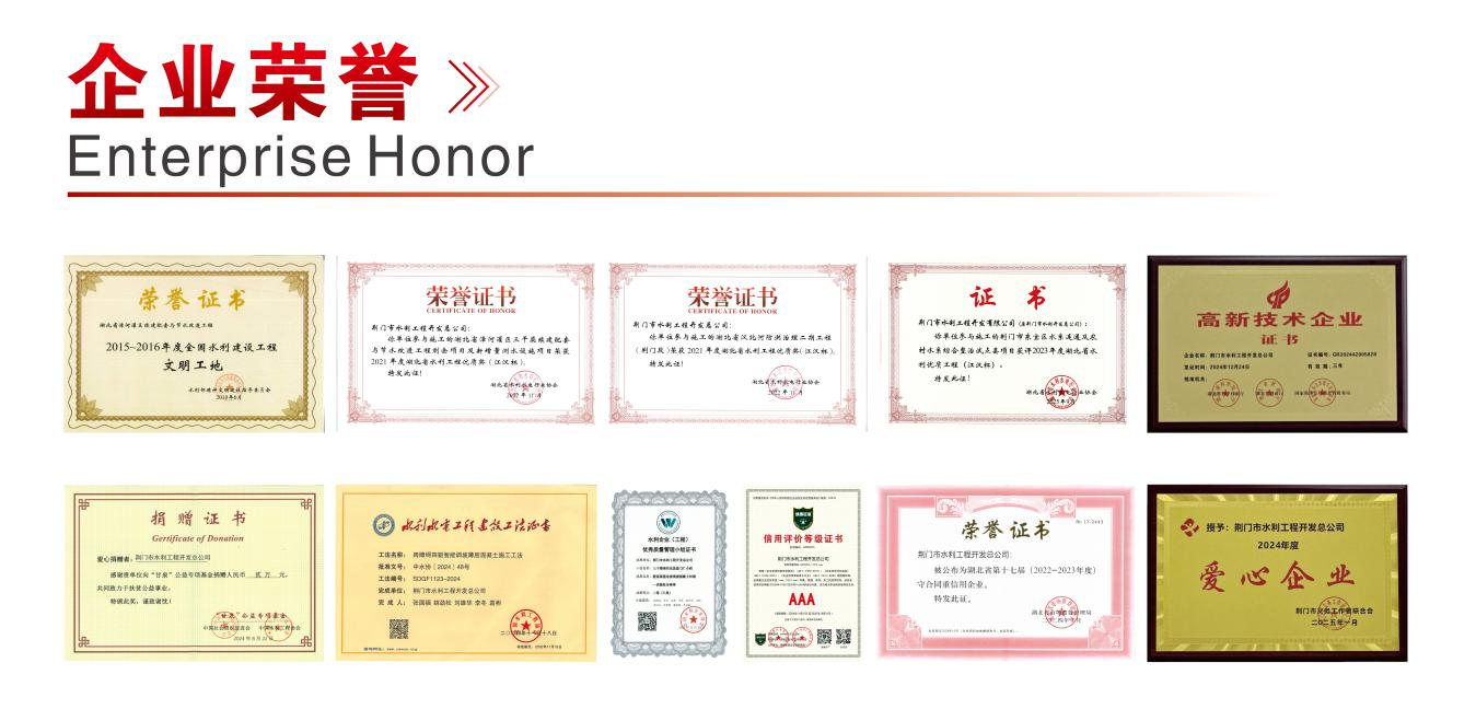 連續(xù)十五年獲評省市級“守合同 重信用”單位的榮譽(yù)稱號(hào),連續(xù)十三年榮獲ISO三體系認(rèn)證證書,連續(xù)五年榮獲水利部頒發(fā)的全國水利建設(shè)市場主體信用等級AAA級證書。先后被國家、省、市主管部門授予全國企業(yè)征信系統(tǒng)立信單位、省市水利系統(tǒng)先進(jìn)施工企業(yè)、先進(jìn)基層黨組織、安全生產(chǎn)先進(jìn)單位等榮譽(yù)稱號(hào)。