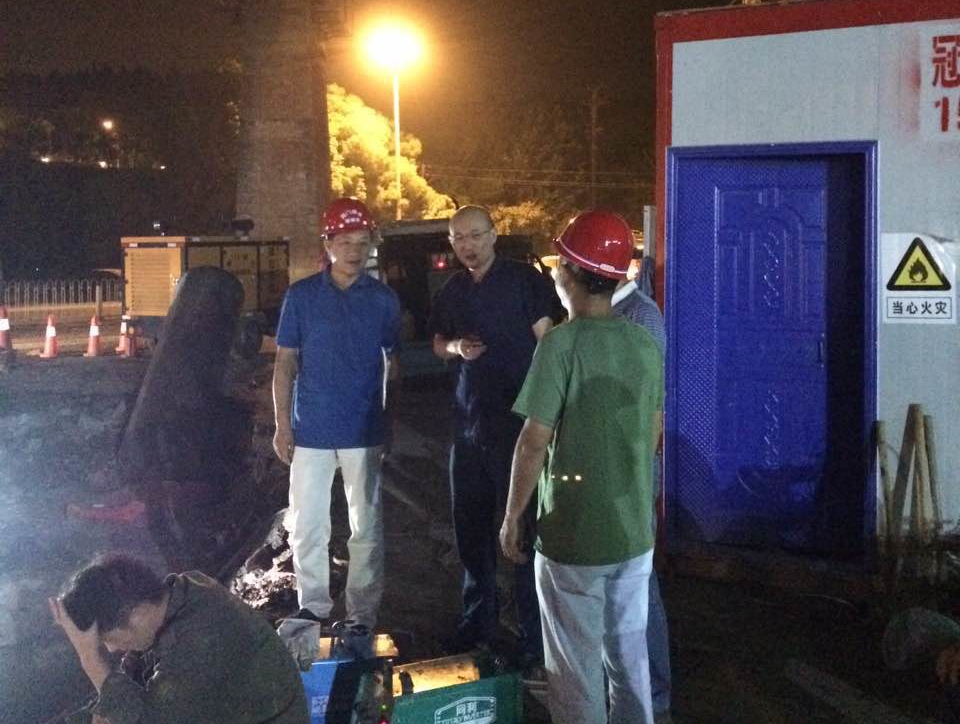 此次施工任務(wù)重、時間緊、戰(zhàn)線長、交叉作業(yè)多、未知因素多,市供水總公司科學(xué)組織、準(zhǔn)備充分、措施有力,創(chuàng)造了荊門供水單次停水施工碰頭數(shù)量最多、停水時間最短的歷史紀(jì)錄!此次施工前,市供水總公司審時度勢,啟動了應(yīng)急預(yù)案,從人員、物資、設(shè)備、應(yīng)急搶險等各方面都做了充分準(zhǔn)備。當(dāng)晚,公司黨委書記、總經(jīng)理陳永根親臨施工現(xiàn)場,坐鎮(zhèn)一線指揮,要求相關(guān)部門集中力量,全力配合,爭取在最短的時間內(nèi)完成施工,盡快恢復(fù)供水。在爭分奪秒的施工過程中,全體參戰(zhàn)單位和人員在總公司領(lǐng)導(dǎo)正確指揮下,發(fā)揚"特別能吃苦、特別能戰(zhàn)斗、特別能奉獻(xiàn)"的“供水鐵軍”精神,團(tuán)結(jié)一心,眾志成城,密切配合,群策群力,譜寫了供水人敢與時間賽跑、敢同困難較勁的“合奏曲”。維修公司、安裝公司、營抄中心工作人員作為搶修主力軍,在悶熱的坑洞下和污濁的泥水中實行分班作業(yè)、輪流施工,艱苦作業(yè)。職能部門管網(wǎng)運維部、工程管理部、客服中心、水質(zhì)檢測公司積極發(fā)揮統(tǒng)籌協(xié)調(diào)能力,調(diào)度應(yīng)急供水車緊急供水、調(diào)配管材物質(zhì)、快速水質(zhì)化驗……竭盡全力地為DN1000管道碰頭施工保駕護(hù)航。