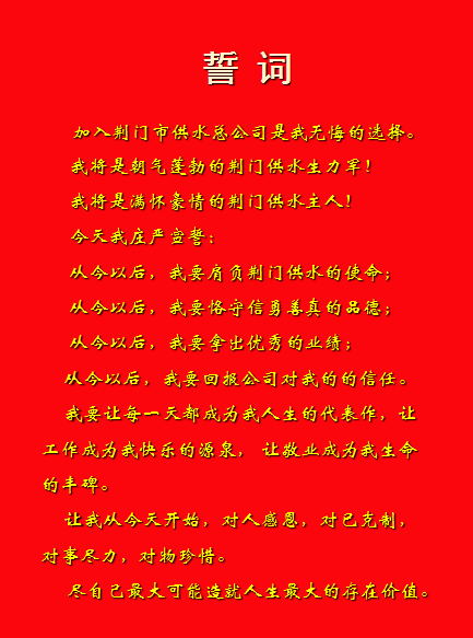 “加入荊門市供水總公司是我無悔的選擇。我將是朝氣蓬勃的荊門供水生力軍! 我將是滿懷豪情的荊門供水主人!今天我莊嚴(yán)宣誓:從今以后,我要肩負(fù)荊門供水的使命;從今以后,我要恪守信勇善真的品德;從今以后,我要拿出優(yōu)秀的業(yè)績......”入職宣誓儀式現(xiàn)場,新進(jìn)員工舉起右拳,莊嚴(yán)宣誓,鏗鏘有力、擲地有聲的誓言響徹在會(huì)議室,久久回蕩在每一位員工的心田,震憾著他們的思想。