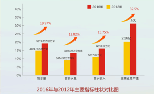 2016年制水量達5219.83萬立方米,較2012年制水量4424.56萬立方米增長19.97%;營抄水量3886.28萬立方米,同比3414.38萬立方米增長13.82%;售水收入6618.57萬元,同比5717.87萬元增長15.75%;2016年公司主輔業(yè)總產(chǎn)值創(chuàng)歷史新高,首次突破3億元,同比2.26億元增長32.5%。