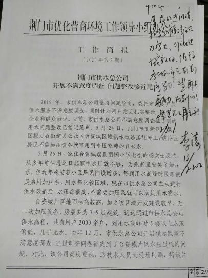7月13日,市委副書記、市委政法委書記李濤在市優(yōu)化辦第2期工作簡報專文《荊門市供水總公司開展不滿意度調(diào)查 問題整改接近尾聲》上作出批示,指出“市供水總公司在改進服務(wù)、提高工作效率方面力度大、行動快、成效好,值得各地和市直有關(guān)部門學(xué)習(xí),望再接再厲,為荊門高質(zhì)量發(fā)展再立新功”,對公司優(yōu)化供水服務(wù)工作給予高度評價和充分肯定。