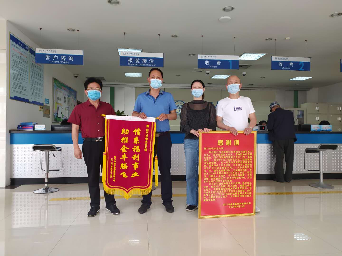 5月15日,金豐公司總經(jīng)理袁家群和東寶區(qū)工商聯(lián)相關(guān)負(fù)責(zé)人來(lái)到市供水總公司,送上感謝信和寫有“情系福利事業(yè) 助推金豐騰飛”字樣的鮮艷錦旗。
